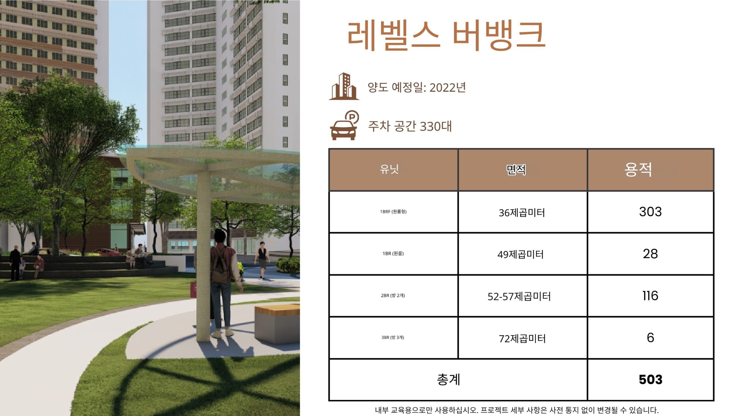 1~3베드 유닛 구성으로 단독 거주자, 가족 단위, 투자 목적 구매자 모두 선택 가능하며,