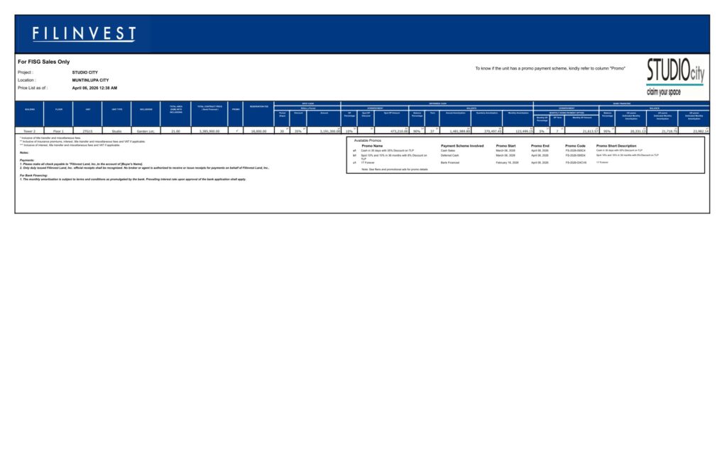 Filinvest Studio City 콘도 분양 관련 유닛 정보, 최신 가격, 프로모션 및 페이먼트 플랜은 별도 문의를 통해 상세 안내드리고 있습니다.