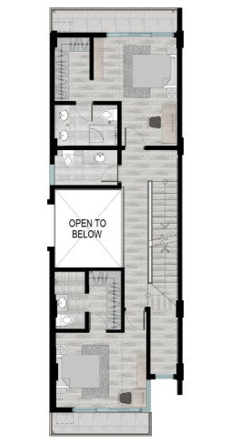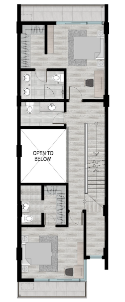 계단에서 바로 연결되는 파우더룸이 있으며, 1층 거실 공간을 내려다보는 오픈 발코니가 마련되어 있습니다.