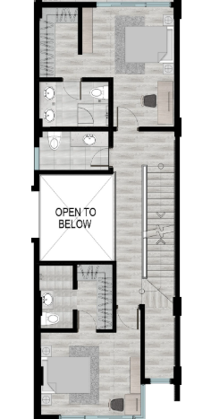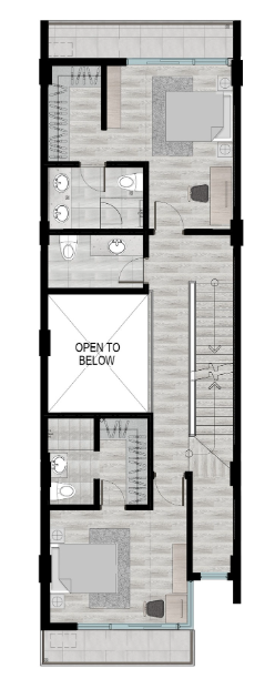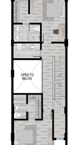 계단에서 바로 연결되는 파우더룸이 있으며, 1층 거실 공간을 내려다보는 오픈 발코니가 마련되어 있습니다.
