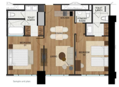 발코니가 딸린 넓은 침실 2개, 워크인 클로젯, 대형 전용 욕실을 갖추고 있습니다.