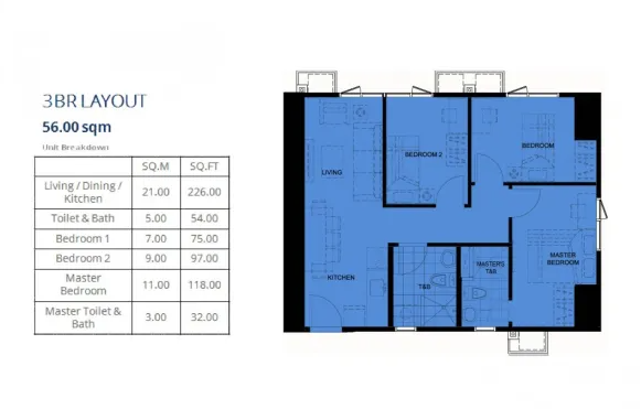 | 쓰리베드룸 유닛 (Three Bedroom Unit) | 3 | 2 | 56 | ₱ | 문의 요망 |