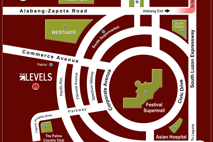 - 남루손 고속도로(SLEX), 알라방-자포테 로드, 커머스 애비뉴, 필인베스트 애비뉴 및 필인베스트 시티 내 주요 내부 도로를 통해 편리하게 접근 가능