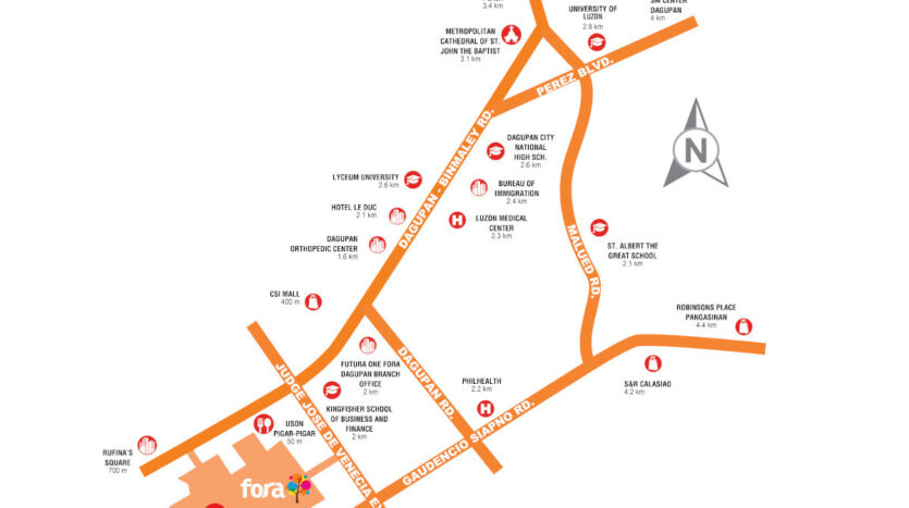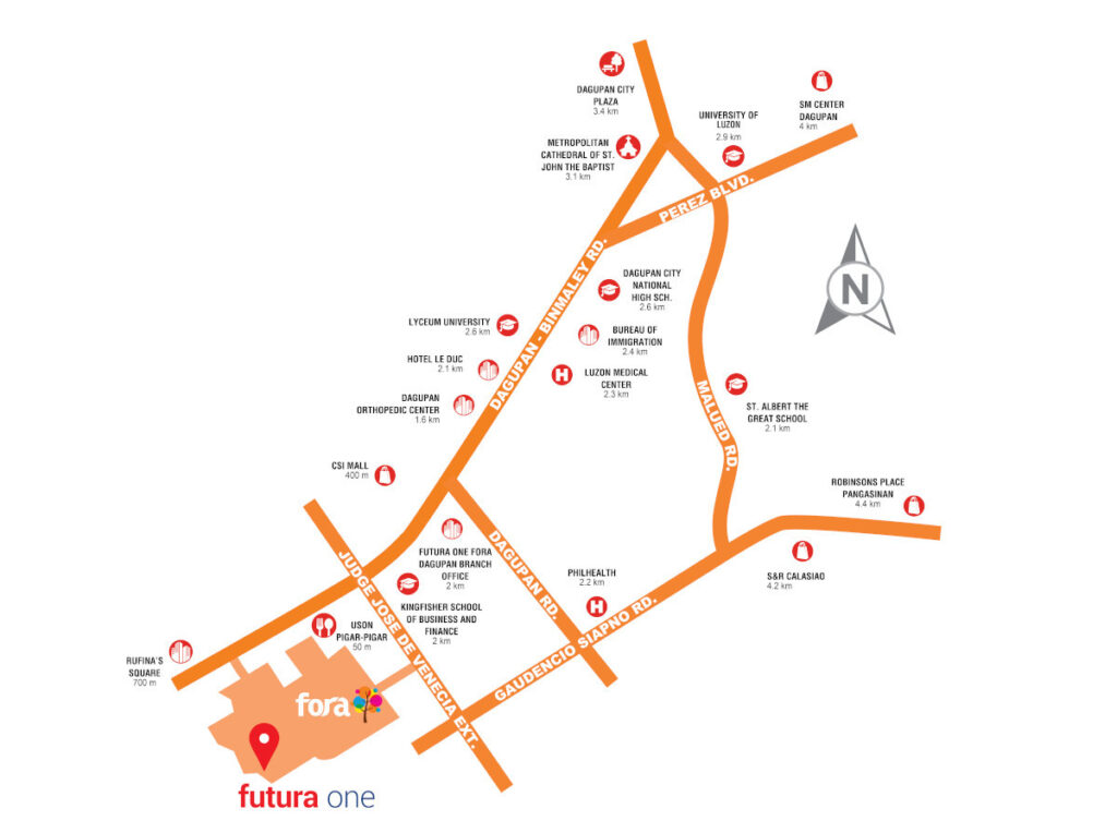 Futura One은 필인베스트(Filinvest)의 떠오르는 비즈니스 허브 포라 다구판(Fora Dagupan) 내에 위치해 있어 토지 가치 상승도 기대할 수 있습니다. 이 복합 개발 단지는 팡가시난 다구판 루카오(Lucao) 지역, 다구판-빈말레이 도로(Dagupan-Binmaley Road) 인근에 위치해 있어 원활하고 통합된 콘도 생활을 제공합니다.