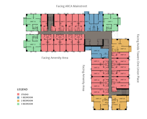 아비다 타워스 비레오의 전형적인 평면도는 유닛 배치와 공간 활용을 한눈에 확인할 수 있도록 설계되었습니다. 각 층마다 스튜디오, 1베드룸, 2베드룸, 3베드룸 유닛이 효율적으로 배치되어, 프라이버시와 편리함을 동시에 제공합니다.