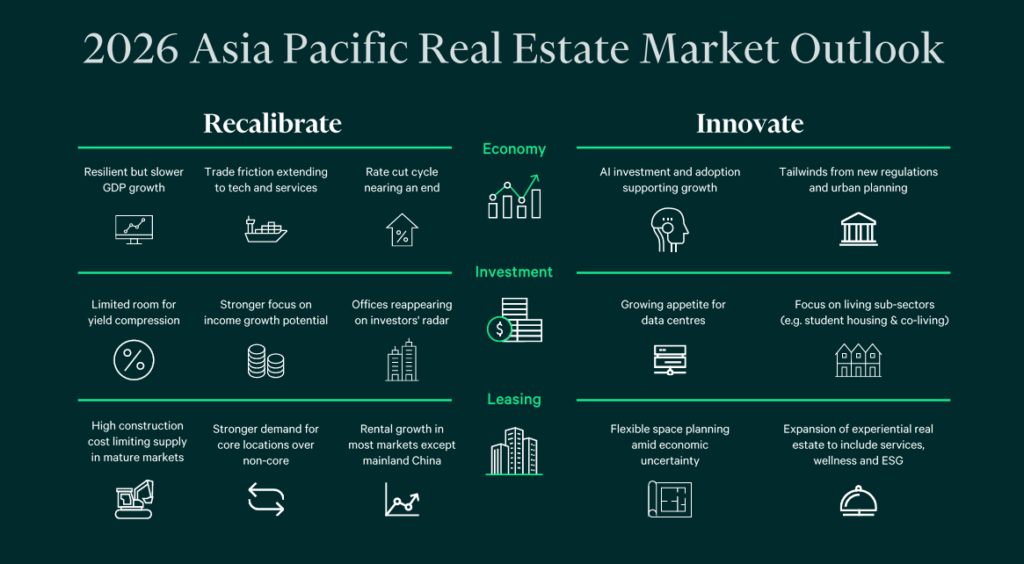 아시아 태평양 상업용 부동산 시장은 역내 전반적인 경제 성장세가 둔화되는 가운데서도 투자자와 임차인들이 수익 성장에 맞춰 포트폴리오를 재조정하면서 2026년을 새로운 활력 속에 맞이하고 있다.