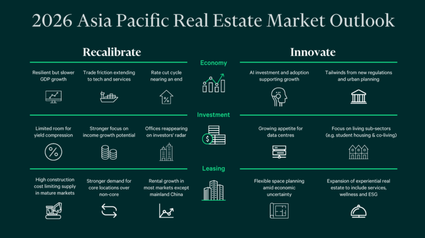 아시아 태평양 상업용 부동산 시장은 역내 전반적인 경제 성장세가 둔화되는 가운데서도 투자자와 임차인들이 수익 성장에 맞춰 포트폴리오를 재조정하면서 2026년을 새로운 활력 속에 맞이하고 있다.