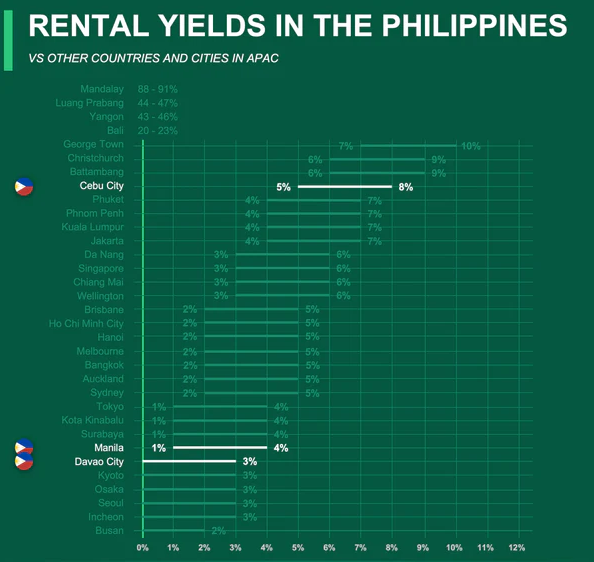 우리는 일부 조사를 수행하고 이 인포그래픽을 제작하여 필리핀 주요 도시의 임대 수익률을 인근 국가와 빠르게 비교할 수 있도록 했습니다. 이 자료는 필리핀이 부동산 투자 목적지로서 어떤 위치에 있는지 명확하게 보여주며, 투자 계획이 있는 분들에게 유용할 수 있습니다.