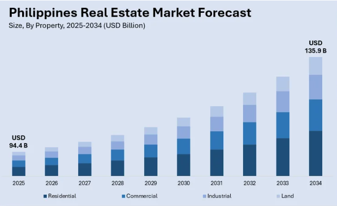 필리핀 부동산 시장 규모는 2025년 기준 944억 달러에 도달했습니다. 향후 시장은 2034년까지 1,359억 달러에 이를 것으로 예상되며, 2026~2034년 동안 연평균 성장률(CAGR) 4.12%를 기록할 것으로 전망됩니다. 이 시장은 도시화, 인프라 개발, 외국인 투자 증가에 힘입어 강력한 성장을 보이고 있으며, 주거용, 상업용, 산업용 부동산을 포함한 다양한 부문에서 수요를 촉진하고 있습니다.