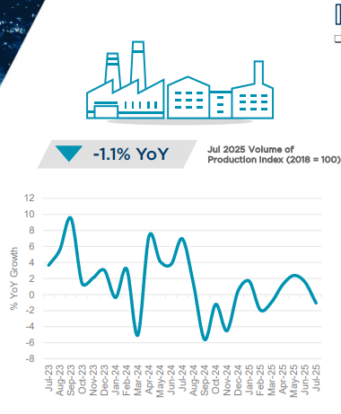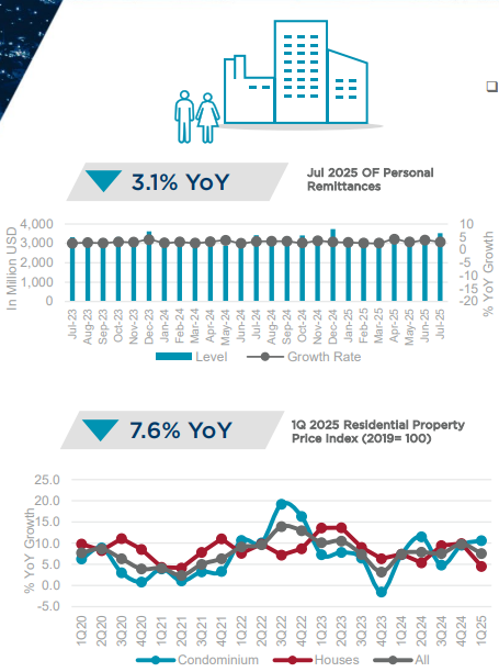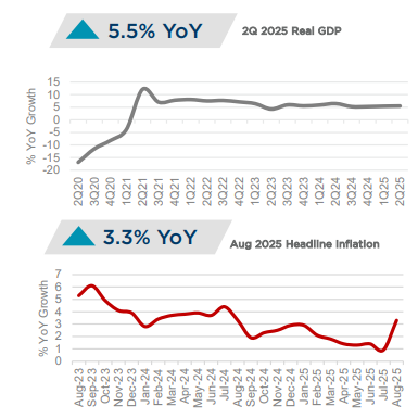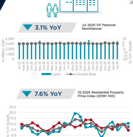 지난 8월 필리핀 중앙은행(BSP)은 기준금리를 25bp 인하하여 세 차례 연속 회의에서 세 번째 인하 조정을 단행했으며, 기준금리를 5.25%에서 5%로 낮추어 2022년 11월 이후 최저치를 기록했습니다. 중앙은행이 2024년 8월 완화 사이클을 시작한 이후 차입 비용은 총 150bp 인하되었으며, 올해 마지막 통화 정책 완화를 시사했습니다. 7월에는 인플레이션이 0.9%로 하락하여 거의 6년 만에 최저치를 기록했으며, 연간 누계 인플레이션은 1.7%를 기록했습니다. 한편, 경제는 2025년 1분기 5.4%에서 2025년 2분기 5.5%로 소폭 증가했지만, 2024년 2분기 성장률 6.5%에서는 하향 조정되었습니다. 중앙은행은 전기료 조정 가능성과 쌀 관세 인상 등 인플레이션 압력을 언급했으며, 국내 수요가 성장을 뒷받침하겠지만, 글로벌 무역 및 투자에 대한 미국 정책의 영향이 글로벌 경제 활동에 부담을 주어 국가의 성장 전망을 흐리게 할 수 있다고 지적했습니다. 또한 Capital Economics는 긴축적인 재정 정책과 수출 약화로 인해 2025년 하반기에 경제가 둔화될 수 있으므로 추가적인 지원이 필요할 수 있다고 언급했습니다.