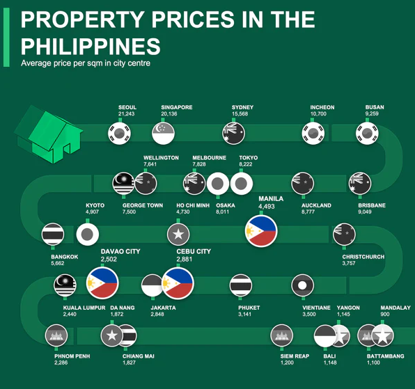 우리는 필리핀의 부동산 가격이 지역 내 다른 주요 도시들과 어떻게 비교되는지 보여주기 위해 이 인포그래픽을 만들었습니다. 이 인포그래픽은 도심 지역의 평균 평당 가격을 분석하여 도시들을 비교할 수 있게 합니다. 이는 어디에서 가장 좋은 가성비를 얻을 수 있을지 쉽게 확인할 수 있는 방법입니다. 마음에 드시길 바랍니다.