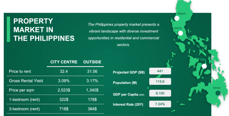 우리는 필리핀 부동산 시장에 대한 빠르고 명확한 개요를 제공하기 위해 이 인포그래픽을 만들었습니다. 이 인포그래픽은 도시 중심지와 외곽 지역의 임대 가격, 수익률, 부동산 비용과 같은 주요 사실을 강조하여 기회를 쉽게 비교할 수 있도록 돕습니다. 우리는 몇 가지 조사를 진행했고, 국가 경제에 대한 유용한 통찰력도 포함시켰습니다. 예를 들어 GDP, 인구, 금리 등의 정보를 제공하여 더 큰 그림을 이해하는 데 도움이 될 것입니다.