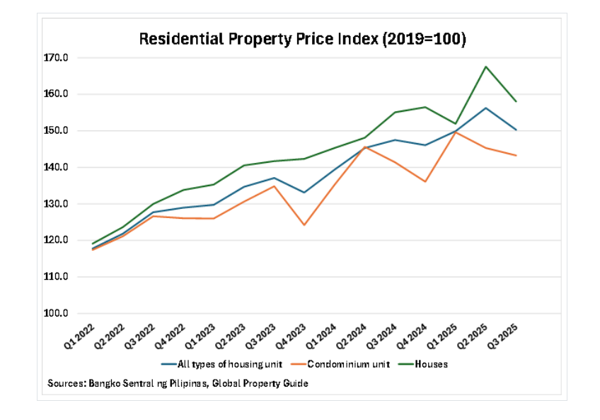 전국적으로 주택 가격 상승률이 빠르게 둔화되고 있습니다. 방코 센트랄 ng 필리핀(BSP)이 발표한 수치에 따르면, 2025년 3분기 전국 주거용 부동산 가격 지수는 전년 대비 1.9% 소폭 상승에 그쳤습니다. 이는 2025년 2분기 7.55%, 1분기 7.56%, 2024년 4분기 9.77%, 3분기 7.58%의 전년 대비 가격 상승률과 비교하면 급격한 둔화입니다.
