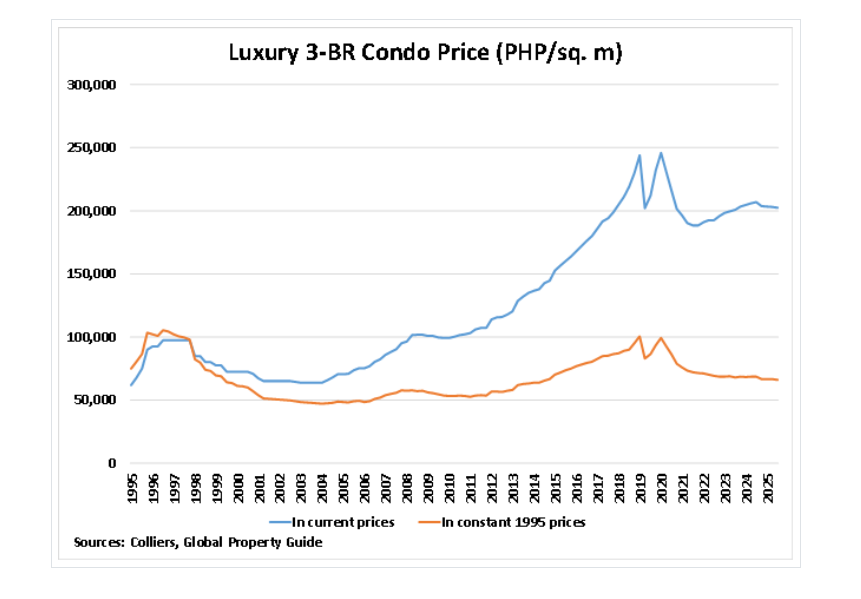 콜리어스 인터내셔널(Colliers International)의 최근 보고서에 따르면, 메트로 마닐라 중심 업무지구(CBD)의 고급 3베드룸 콘도미니엄 평균 가격은 2025년 3분기 전년 동기 대비 2.04% 하락한 평방미터(sqm)당 PHP202,590(US$3,451)를 기록했습니다. 이는 전년 대비 가격 하락이 세 분기 연속 이어진 것이며, 2022년 1분기 이후 최악의 수치입니다. 실질 가격으로 보면, CBD 고급 부동산 가격은 같은 기간 3.71% 하락했습니다.
