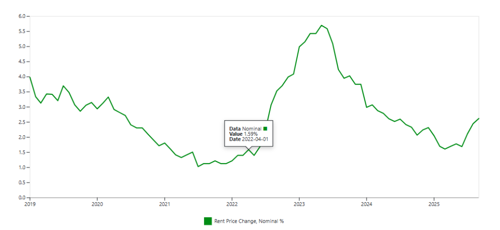 분기별로는, 2025년 3분기 주택 가격이 0.21% 소폭 하락(-1.14% 인플레이션 조정)했습니다.