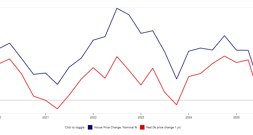 분기별로는, 2025년 3분기 주택 가격이 0.21% 소폭 하락(-1.14% 인플레이션 조정)했습니다.