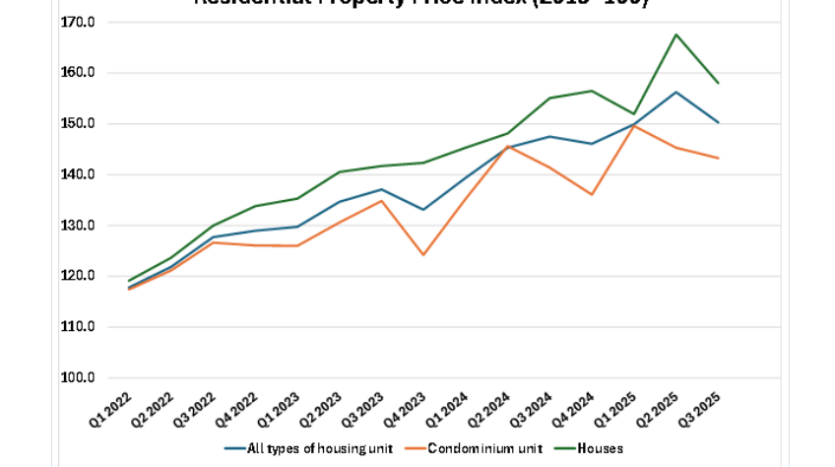 - 콘도미니엄의 경우, 2025년 3분기 평균 가격은 전년 대비 0.8% 소폭 상승했으며, 이는 2024년 3분기 5.3% 상승 이후 둔화된 수치입니다. 분기별로는 최근 분기에 콘도 가격이 1.4% 하락했습니다.