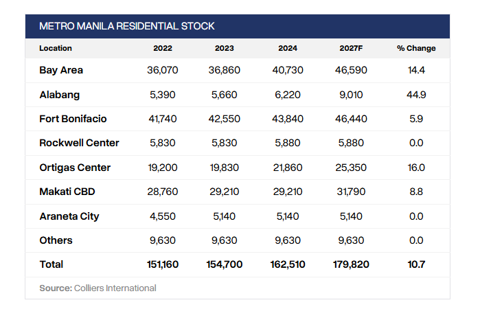 전반적으로 메트로 마닐라의 콘도미니엄 재고는 2027년 말까지 약 179,820유닛에 이를 것으로 예상되며, 이는 2024년 대비 10.7% 증가한 수치입니다.