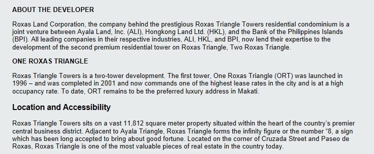 You may find the most expensive and luxurious condo for rent in Two Roxas Triangle Makati Ave, Makati at Two Roxas Triangle. While you can find classy yet affordable ones also at the same location.